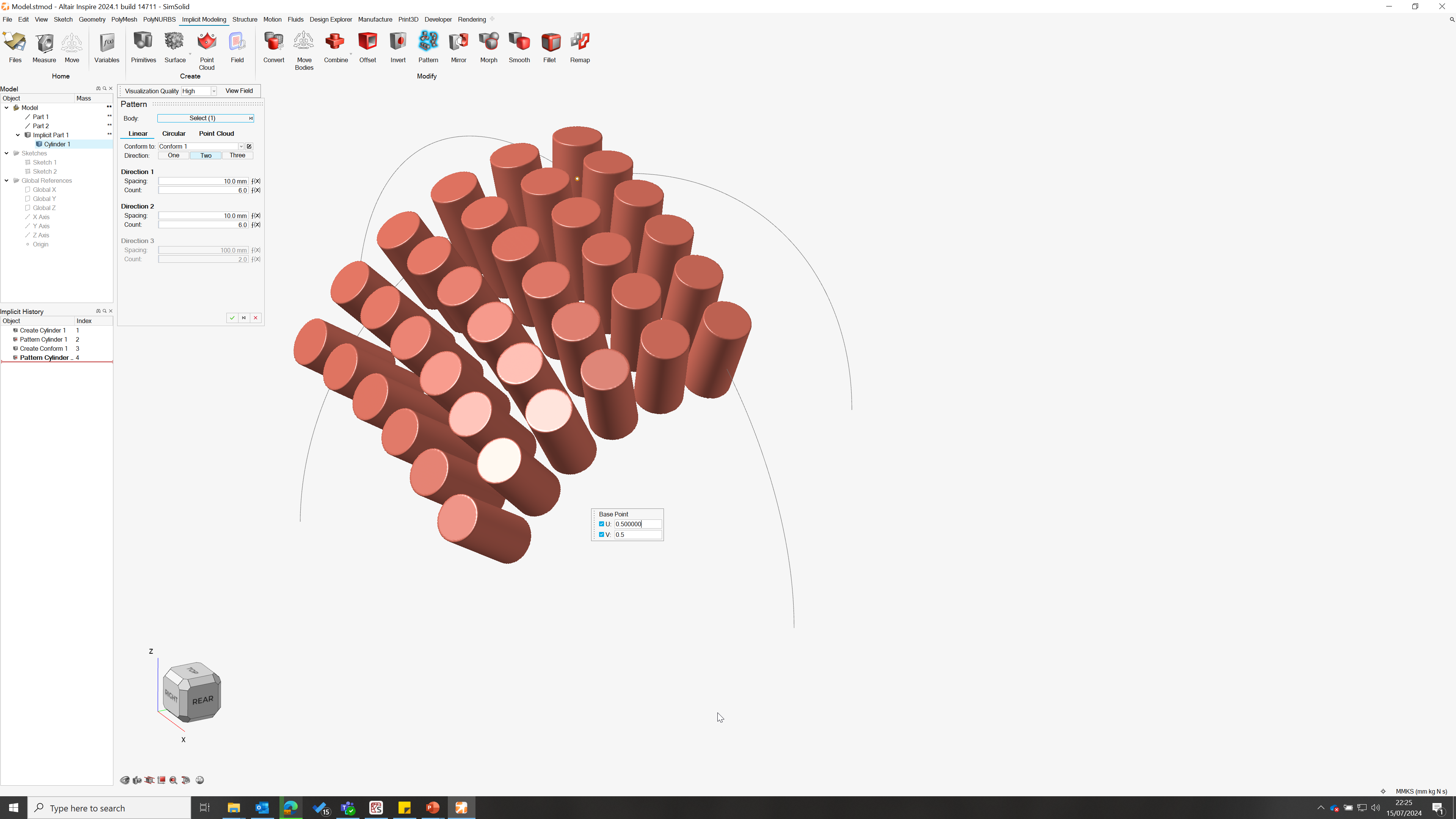 - 为使用的每个参数坐标方向(U、V 和 W,视需要而定)选择模式的基点。基点是每个参数坐标方向上的一个点,几何体的原始实例将其作为模式的起点。