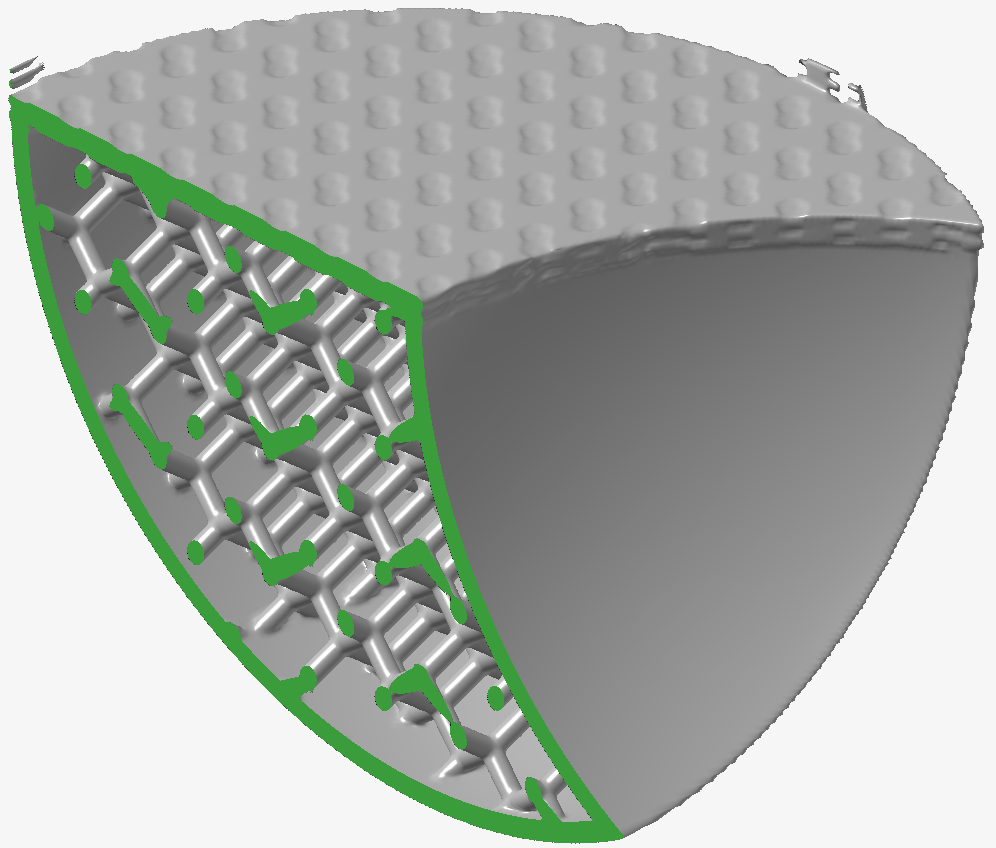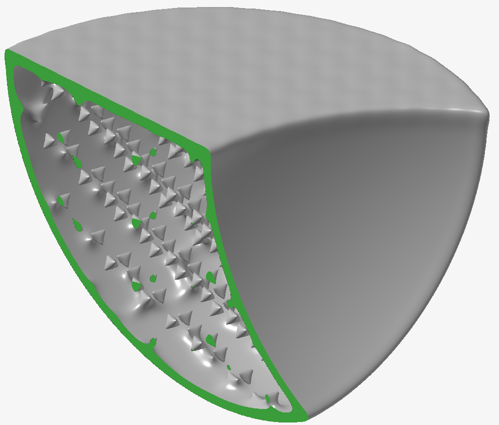 为了突出不同平滑化滤波器的优点和缺点,构建了以下测试模型。它由球形表面、平面、具有精细细节的嵌入式支柱格栅结构以及顶面上故意设计不良的纹理组成,从而在模型中留下噪声伪影。由于某些布尔运算的结果,模型中还存在高曲率区域(有些锐边和角)。绿色来自于使用剖面来显示物体内部的格栅结构。