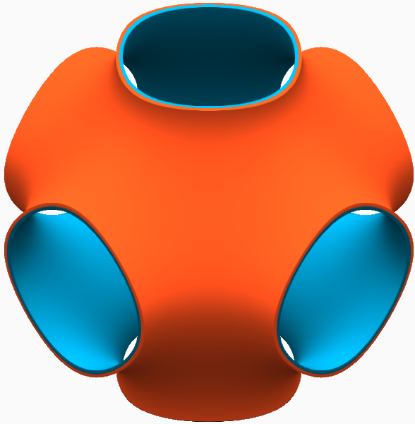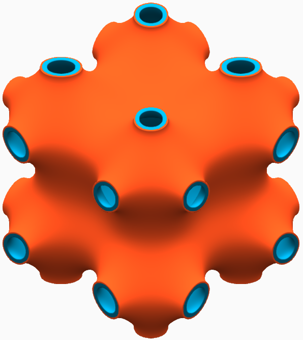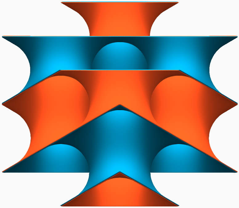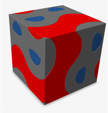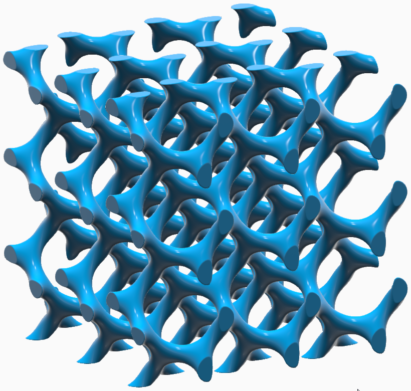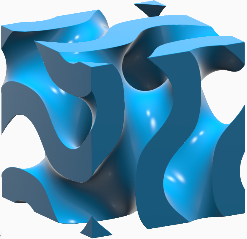 选项 描述 曲面 - 单位单元格 选择单位单元格类型。在下面的图像中,创建格栅的曲面在曲面的一侧显示为蓝色,在另一侧显示为橙色。使用表面类型选项(单和双)将这些无限薄的表面转换为实体体积,这将在下一部分中进行描述。 - Gyroid