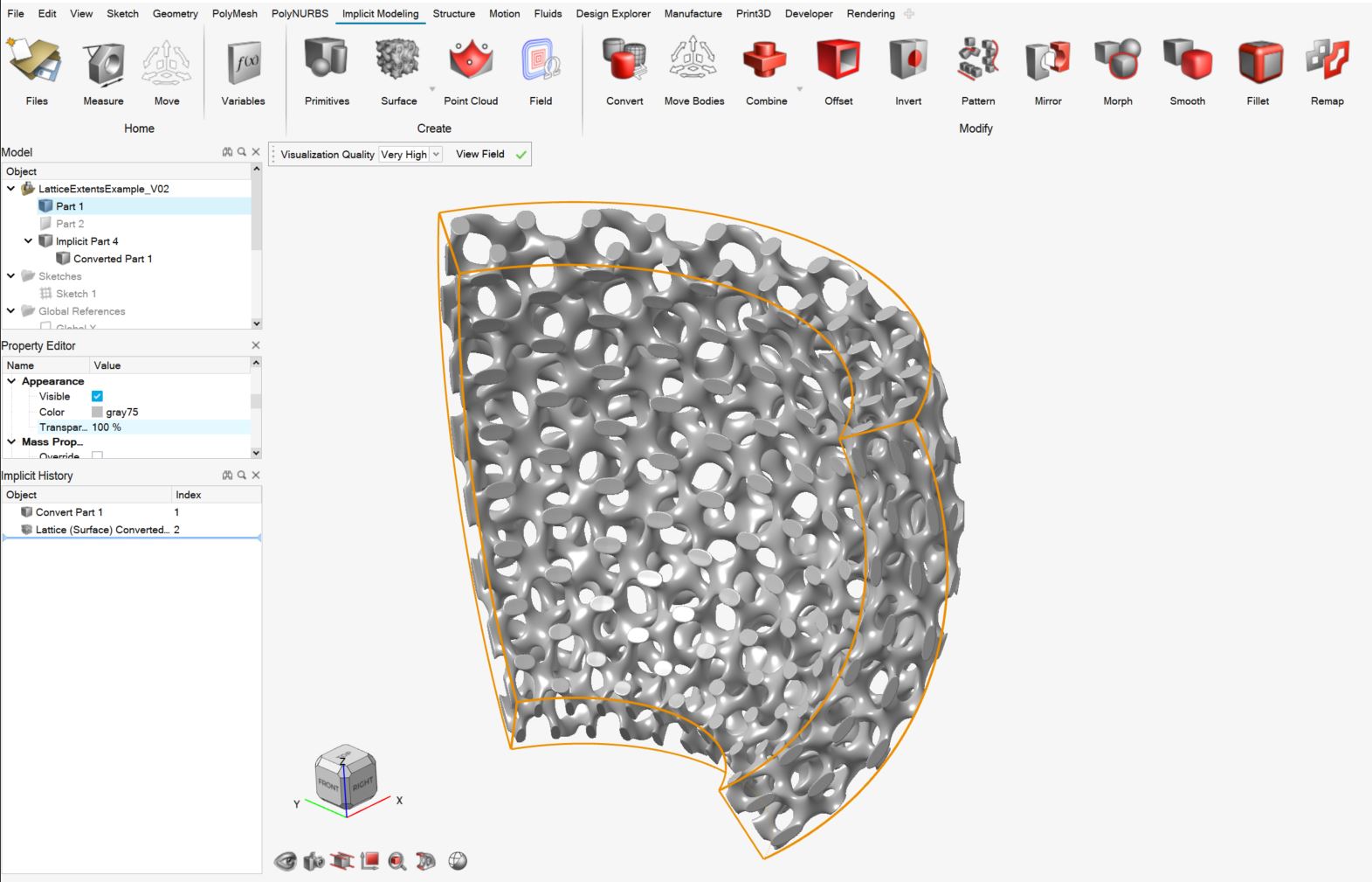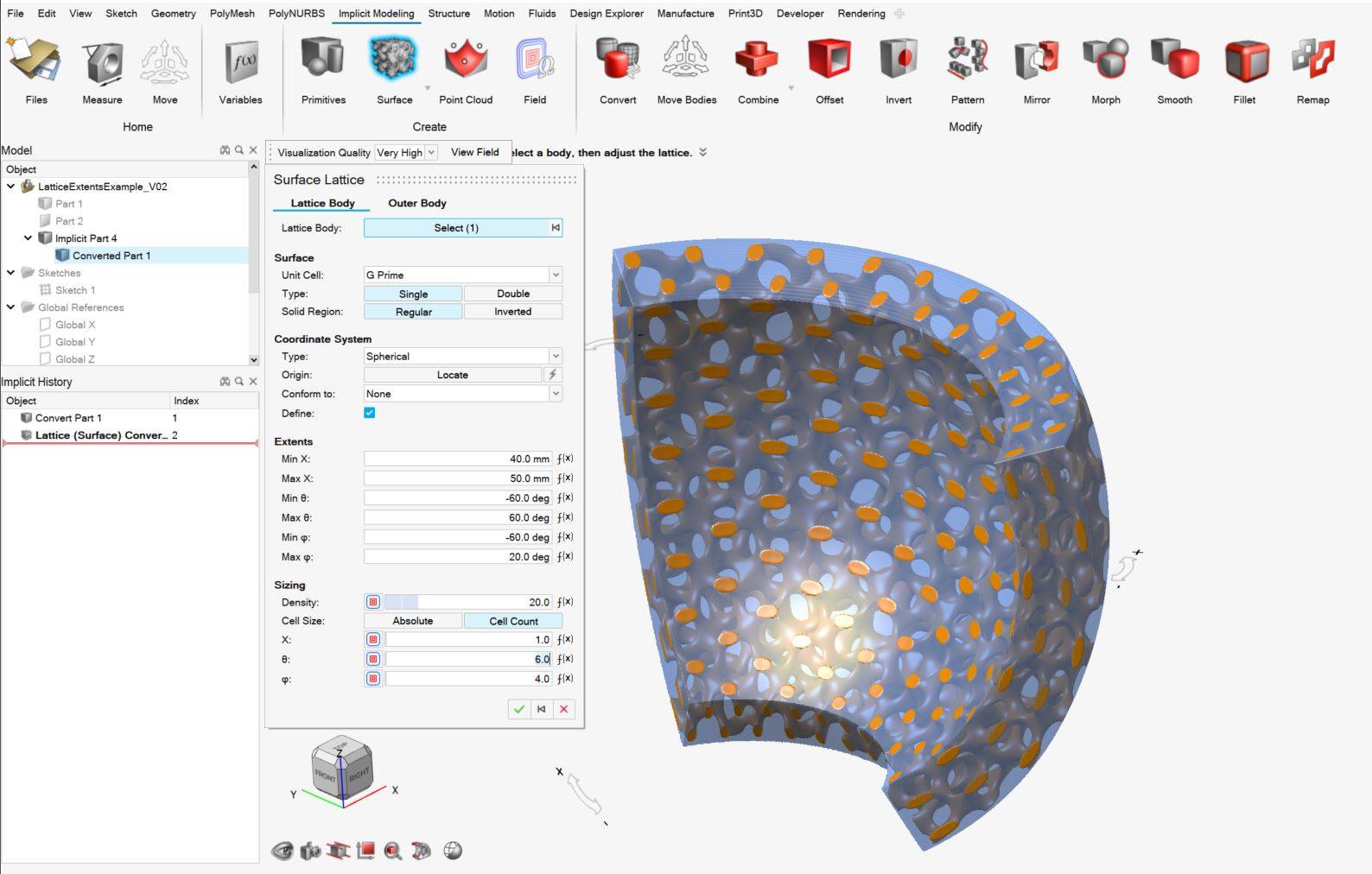 使用曲面格栅结构填充主体,曲面格栅结构是由一个或两个曲面构成的单元结构。主体可以是 Parasoli、STL、PolyNURBS 或隐式几何体。