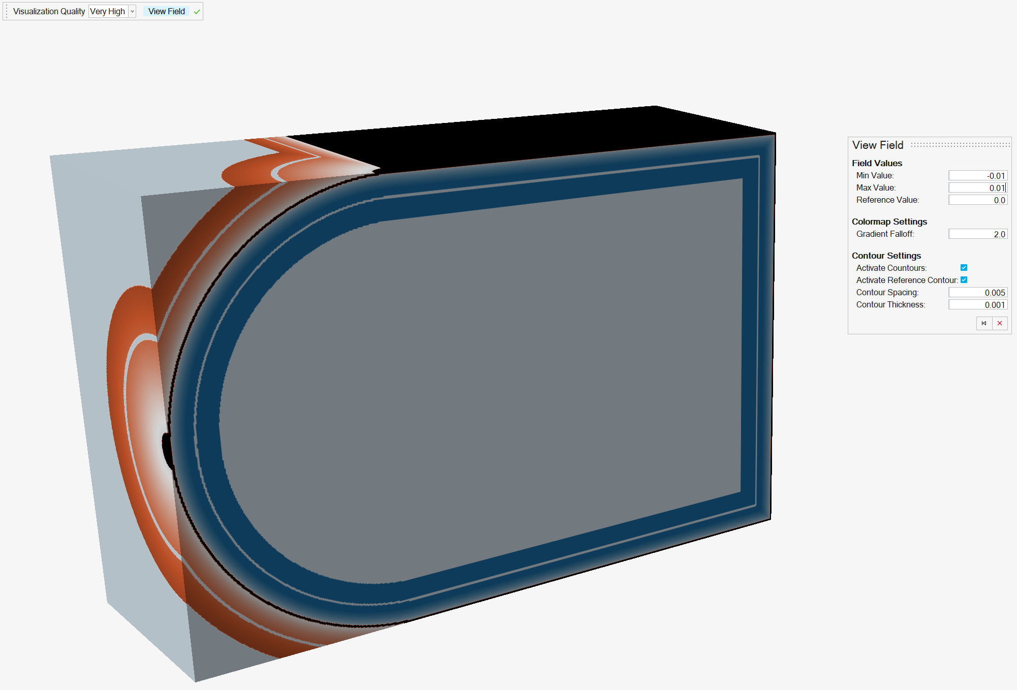 我们现在在偏移表面的位置有黑色轮廓。色图的蓝色区域不再可见,因为现在最小值和最大值范围内的场值位于新指定的参考值的内部。这是关键点:色图会将小于参考值的场值标记为蓝色,将大于参考值的场值标记为红色。在演示的其余部分,我们将调整场最小值和最大值设置来为整个体积着色。
