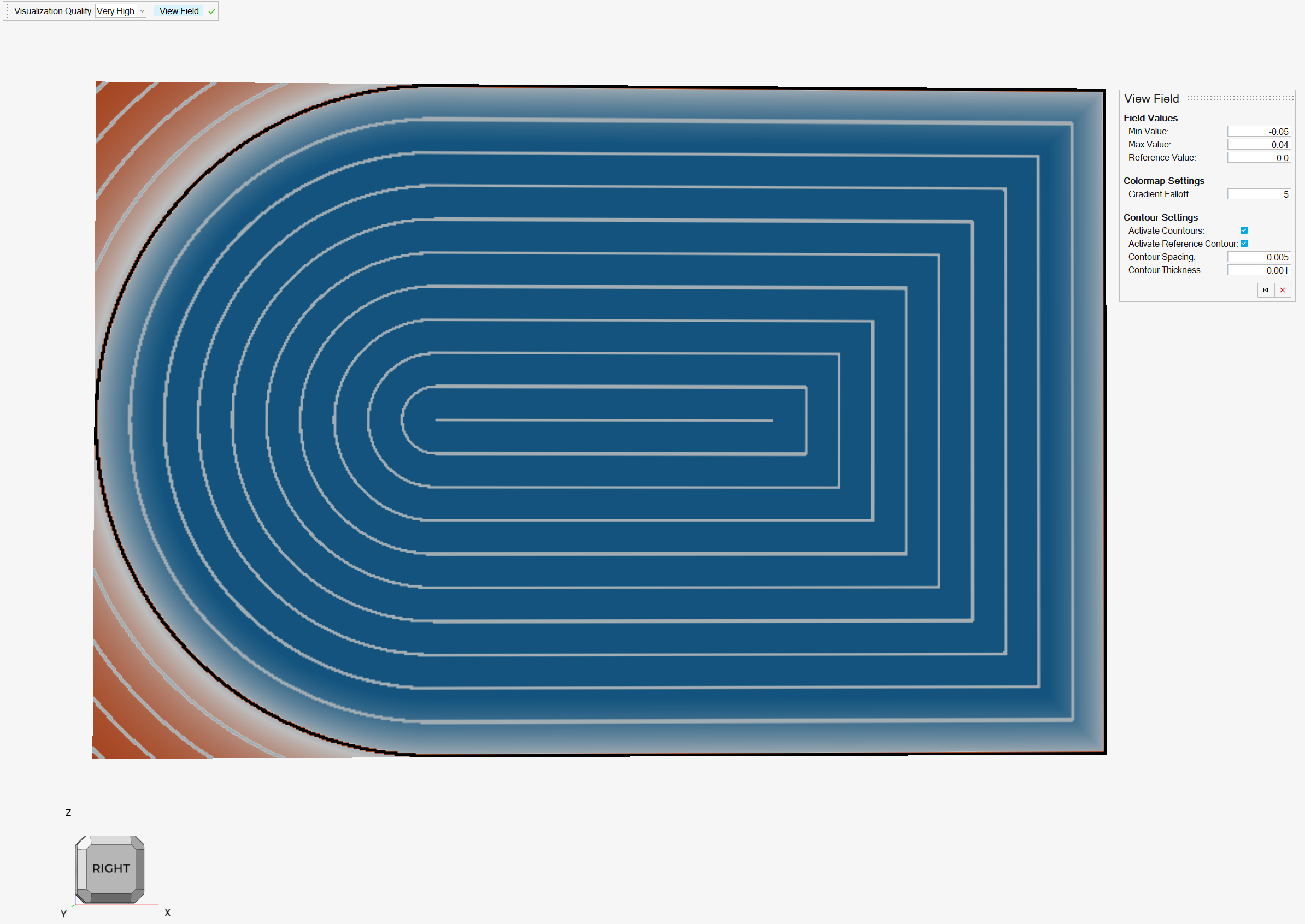 通过场值控件,我们可以设置目标场值,这些场值将由“查看场”工具进行着色和绘制轮廓。例如,我们可能只对距离表面 +/-10mm 的场值感兴趣。可以通过以下设置实现: