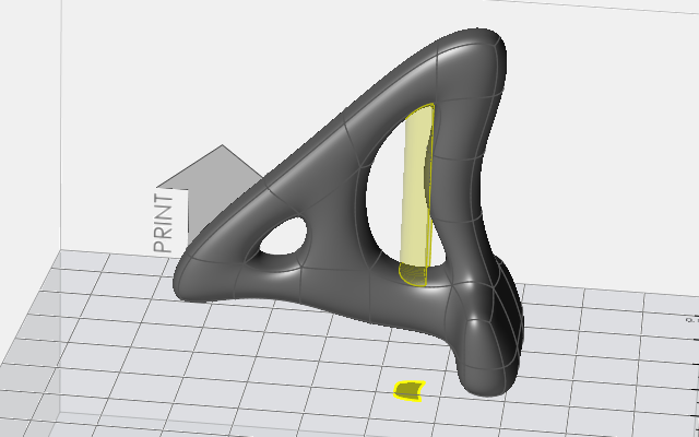 3D 打印零件时,零件上角度小于 45 度的曲面需要在打印过程中添加支撑材料。当方向或支撑工具被选中后,这些区域会以黄色高亮显示。