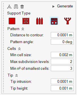 支撑类型 配置选项 块 配置模式、尖端和孔。  杆 配置模式和尖端。  H 形单元格 配置模式、单元格和尖端。  树形 配置模式、分枝和尖端。