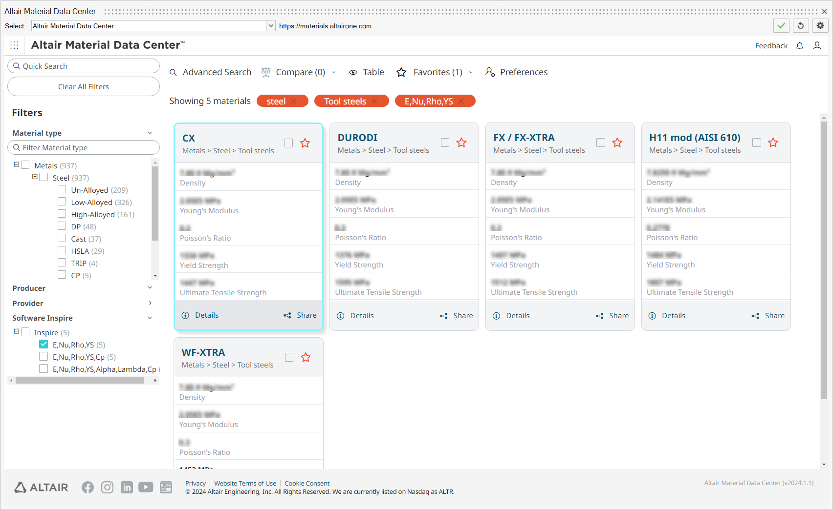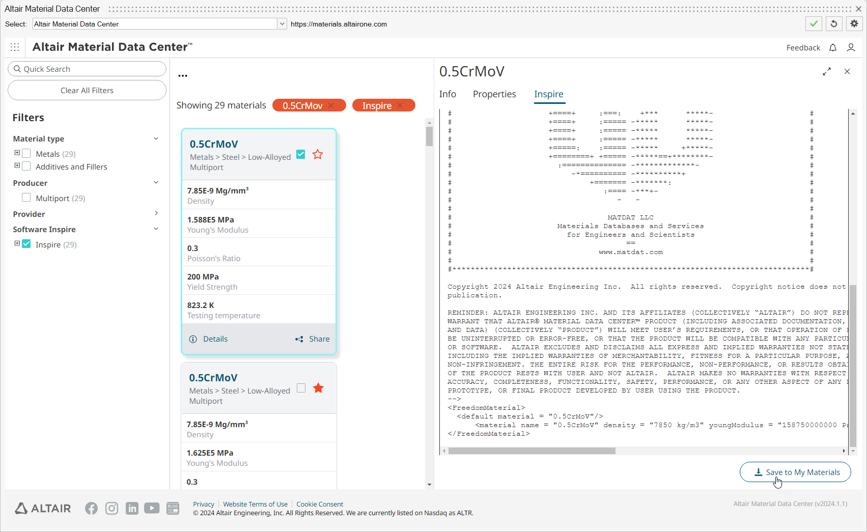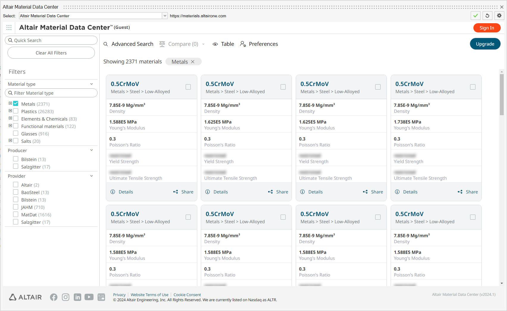 AMDC 的基本访问是免费的。作为访客用户,在浏览器中打开 https://materials.altairone.com,查看所有可用的材料和材料制作者的名称,以探索数据库。免费创建一个 Altair One 账户以解锁更多信息并使用高级搜索工具。