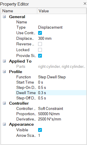 - 在平动电机小对话框中,将位移大小更改为 300 mm。
