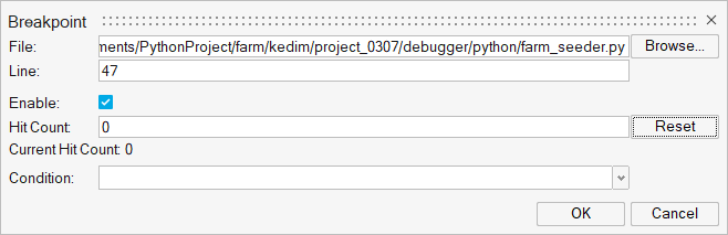 断点窗口显示调试会话中的所有断点。每个断点都会与主文件和行号一起列出。
