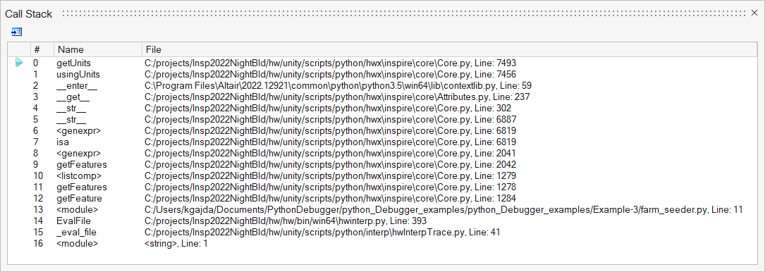 注: 必须先保存编辑器中的 Python 脚本。未保存的文件名将附加 *。激活调试模式后,调试菜单下的其他窗口将变为可用。 - 点击所需行旁边的左侧空白即可设置断点。