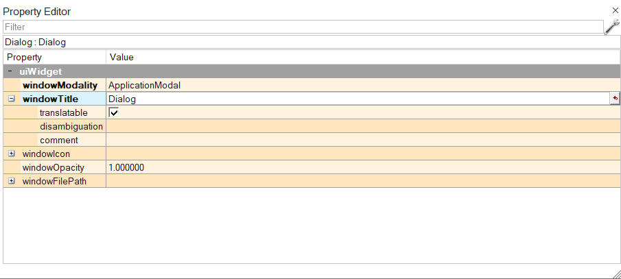 - 在属性编辑器中,选择 [widget]Title 字段,然后输入所需名称。顶层对话框仅可在对象检查器中重命名。