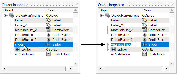 当设计被保存为 Python 文件时,名称的更改也反映在代码中。 - 在对象检查器中双击对象,并输入所需名称。