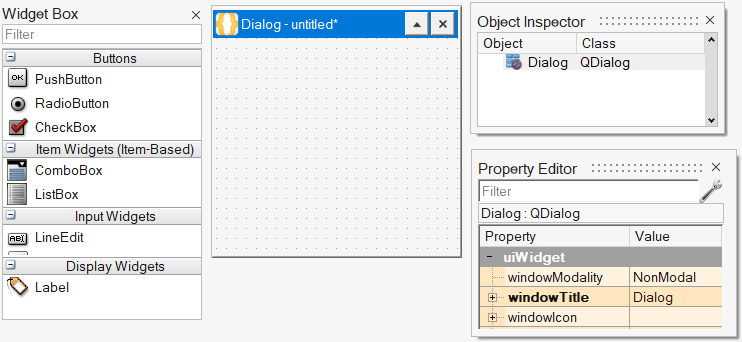 从小部件框中将对象拖动至对话框,以创建您的 GUI 设计。