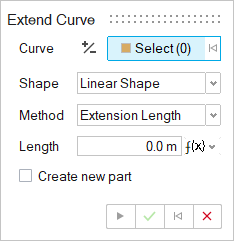 方法 则 延伸长度 输入延伸本身的长度。 增量因子 输入一个增量因子,该因子会按百分比增加长度。例如,如果输入值 0.1,则长度将增加 10%。 总长度 输入曲线的总长度。 至曲线/曲面 - 在延伸至旁边,点击选择按钮。