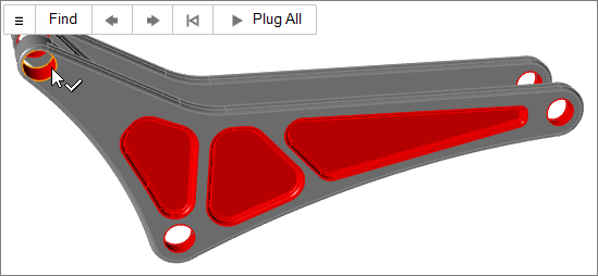 提示: 要查找并打开工具,按 Ctrl+F。更多信息请见查找和搜索工具。默认情况下,模型中的所有孔和凹处都会被选和中且高亮显示为红色。发现的孔/凹处的总数将显示在填塞工具的上方。 - 在当前显示工具的右下角选择
