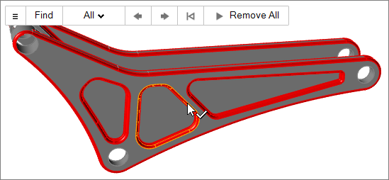 提示: 要查找并打开工具,按 Ctrl+F。更多信息请见查找和搜索工具。默认情况下,模型中的所有圆角/倒角都会被选中且高亮显示为红色。发现的圆角/倒角的总数将显示在“圆角”工具的上方。 - 在当前显示工具的右下角选择