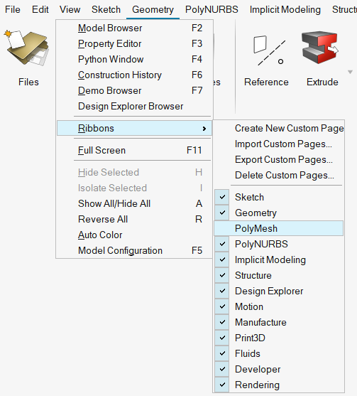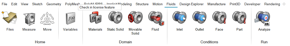 图 1. 示例:检入 PolyMesh 选项卡. 在本例中,我们选择了 Fluids 选项卡以退出 PolyMesh 选项卡。然后右击 PolyMesh 选项卡以选择检入许可功能。