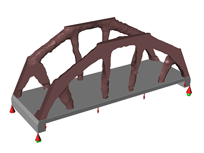 优化产生的新形状完全位于初始设计空间内部,因为在优化过程中只会剔除而不会增加材料。运行优化前,需要指定要保留的材料所占设计空间的百分比,或者直接输入一个目标重量。如下图所示,透明的外部形体是初始零件(即设计空间),而内部桥梁式结构则是优化后产生的形状。图 1. 拓扑优化设计空间