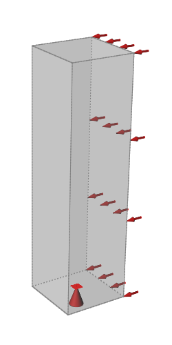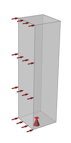 同一种载荷或位移可能包含在不同的载荷工况中。在下图中,“工况 1”和“工况 2”都包括建筑物底部所承受的地面固定约束,但使用了两种不同的压力,分别代表来自东向和西向的风。图 1. 工况 1:西风与地面固定约束