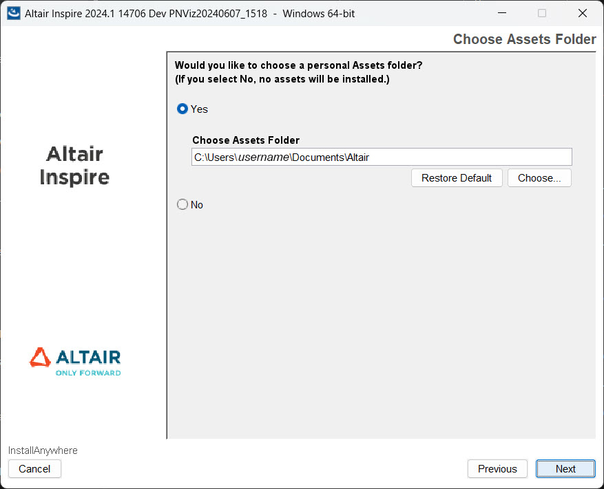 - 接受默认位置 C:\Users\<username>\Documents\Altair。