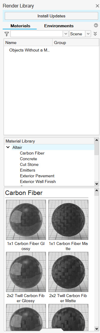 资产文件夹包含一组用于渲染的默认图像、纹理、材料、模型和环境。用户自定义的材料和环境也会保存在资产文件夹的用户子文件夹中。您可以安装完整版 Altair,并在更新在线库时继续安装更新。
