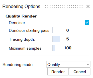 提示: 要查找并打开工具,按 Ctrl+F。更多信息请见查找和搜索工具。此时会显示渲染选项窗口。 - 定义渲染设置(如果还未定义的话)。更多信息请见定义渲染设置。
