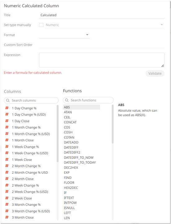 To search for a particular column or function, enter it in the Search Columns/Search Functions box.