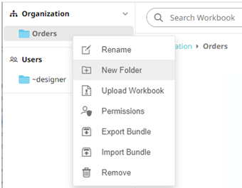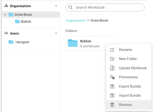 - You can also opt to delete a subfolder by right-clicking on the folder and selecting Remove on the context menu as long as it does not contain published workbooks.
