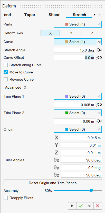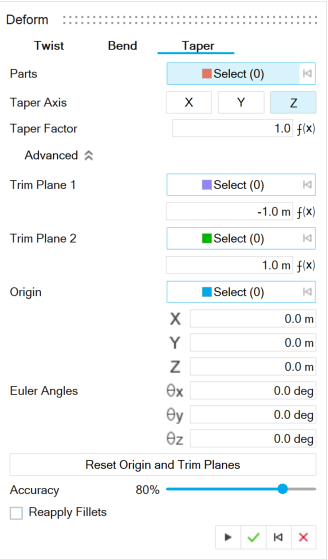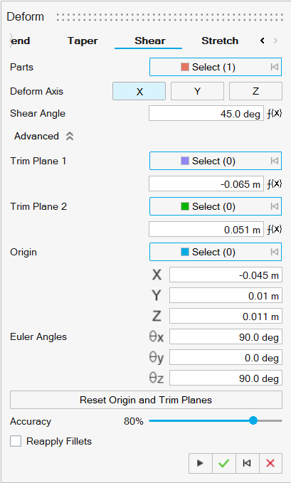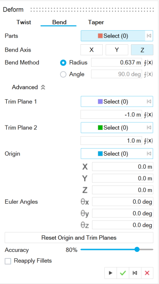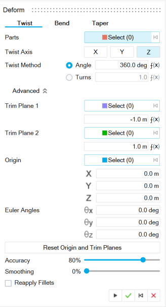 Origin Select Origin: Select a point as the origin. Trim Plane 1 and Trim Plane 2 are offsets from the deformation’s origin. Adjust the origin to simultaneously move both trim planes. Euler Angles X