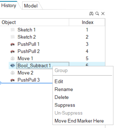 When you create, modify, move, or delete geometry in your model, or group parts together in the Model Browser, Inspire PolyFoam records the action in your model’s construction history.