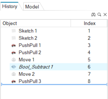 - Delete Without History removes the part from the model without recording the event in the model’s construction history.