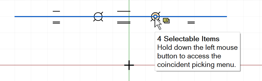 This indicates that you can hold down the left mouse button to access the coincident picking menu, from which you can select the desired sketch entity.