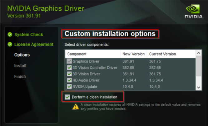 The NVIDIA Driver Update recommendation is to use the Custom installation option and select the Perform clean installation option to validate that there are no conflicts in DLL/drivers.