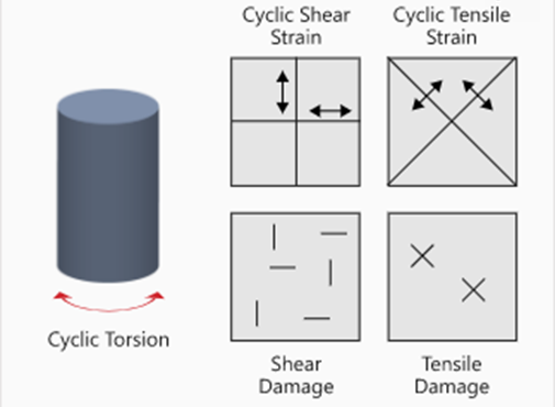 growth due to shear, and the other is for crack growth due to tension.Figure 1. Cracks driven by Shear and Tensile Stress Figure 2. Cyclic, Torsion, Shear Strain, Tensile Strain, Shear and Tensile