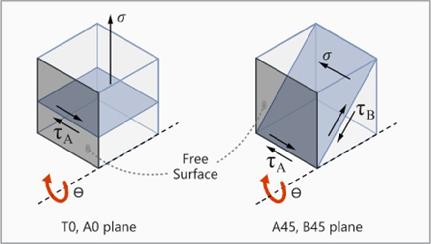 occurs on planes oriented 45 degrees to the surface. Both in-plane and out-of-plane