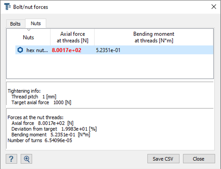 icon. - In the modeling window, click on either a nut or a bolt to see forces listed in the Bolt/nut forces dialog.