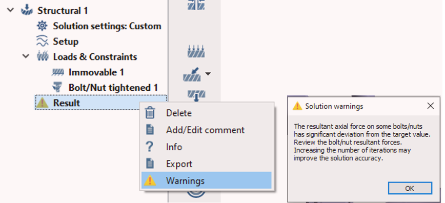 Note: When the resultant axial force of the nut deviates by over 10 percent, the following occurs:- In the Project Tree, a warning icon appears