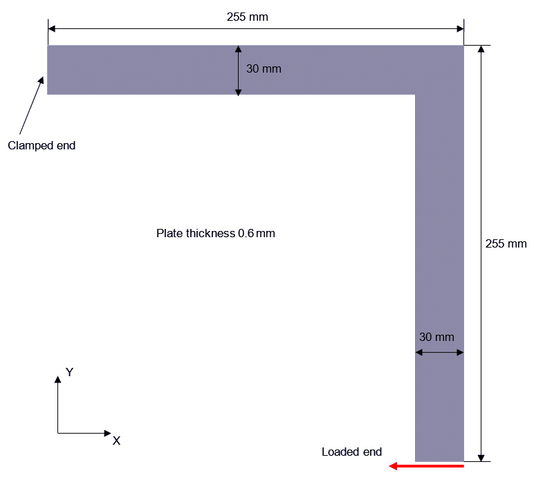 Test No. VNL03 Perform analysis of buckling and post-buckling of a thin-walled frame-like structure in the shape of right angle.