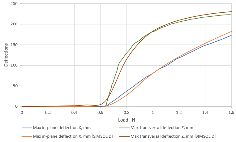 Figure 2 shows maximum deflections versus applied load. The load-lateral deflection curve is in a good agreement with the results reported in the reference. Transversal post-buckling behavior at first is associated with a very small transversal stiffness, but then the load carrying capacity increases (load-displacement curve flattens). In-plane behavior is almost monotonic, no capacity increase occurs in the range of load change.