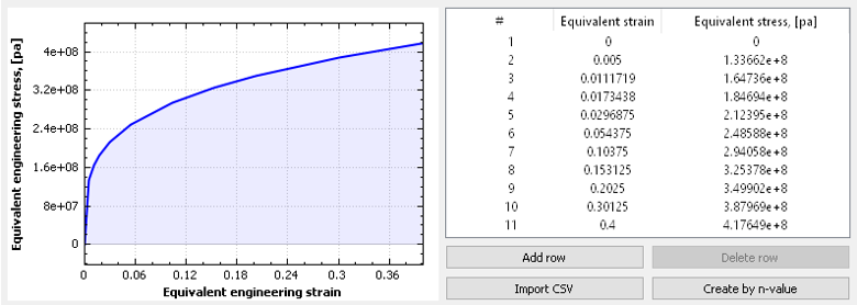 Bar dimensions are 10 x 10 x 200 mm. Distance between loaded point and left end A=50 mm. Strain-stress curve of the bar material is defined by the power law: