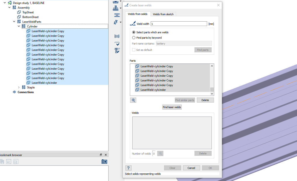 - In the Create laser welds dialog, select the Find parts by keyword radio button and type Weld. Then click Find parts.