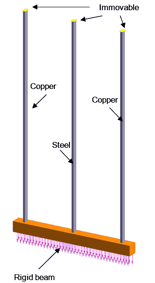测试编号 VTL01 求出承受载荷和均匀升温的带刚性梁、钢杆和铜杆的支座结构中的应力。