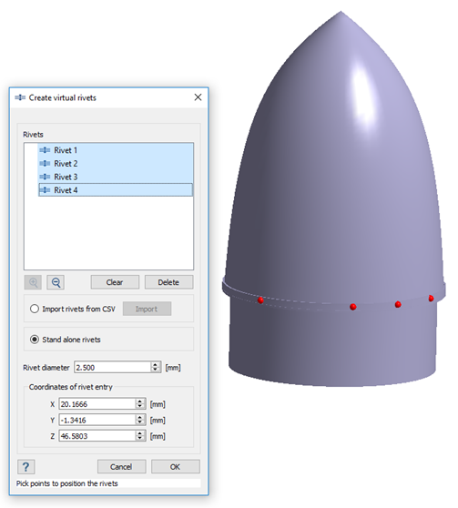 - 在创建虚拟铆钉对话框中,对于铆钉直径,输入 2.500。