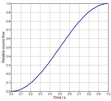 The parameter Startup time > 0 describes the time, within whi ch the flow reaches Nominal volume flow starting at 0. The figure shows the startup function for Startup time = 1.