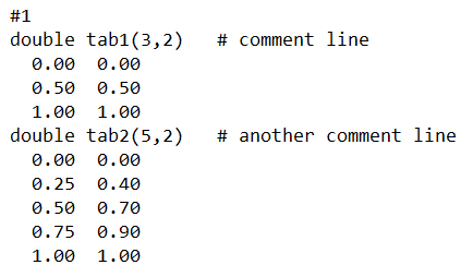 A table is declared by its datatype (e. g. double), followed by the table name (e. g. tab1) and its dimensions in brackets (e. g. (5,2)). As can be seen, multiple tables can be defined in the same text file. The table declaration is followed by the actual data. The first column of the table represents the input of the 1D table, whereas the second column lists the corresponding output values. The input values of the table must be in increasing order. The component interpolates linearly between the listed input values. More information regarding the format of tables can be found at CombiTable1D.