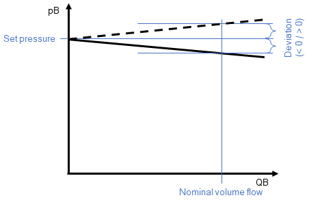 For all pressures exceeding Set pressure (relative value) the valve opens and the flow increases linearly following the slope given by parameters Nominal volume flow and Pressure drop. The outlet pressure deviates by Deviation P-A @ Nominal volume flow.