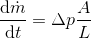 This equation is the hydraulic formulation of Newton's second law of motion. It states that the temporal change in mass flow rate is equal to the pressure difference across the component, multiplied by the cross-sectional flow area and divided by the length of the component.