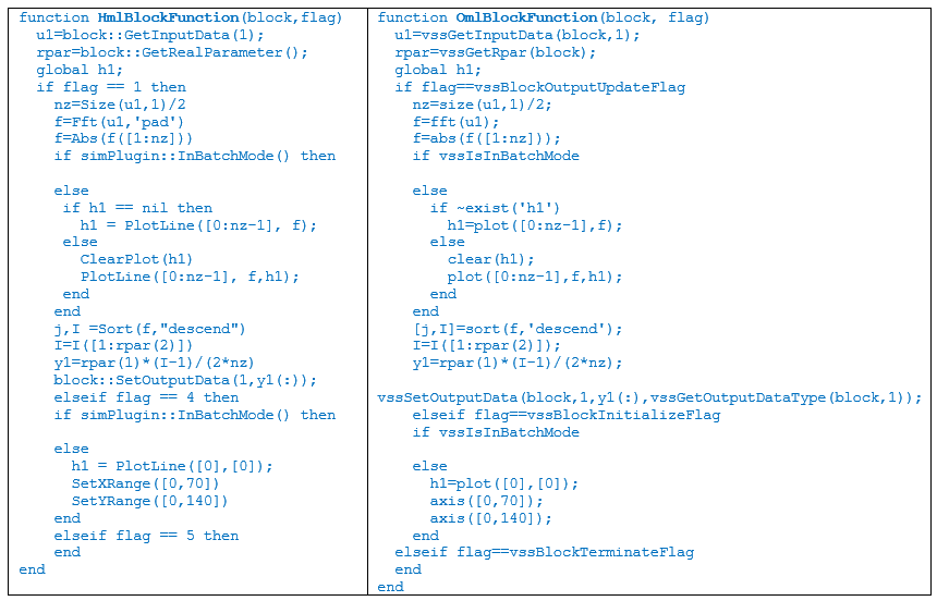 function OmlBlockFunction(block,flag) u1=vssGetInputData(block,1); nevprt=vssGetEventCode(block); if flag == vssBlockInitializeFlag elseif flag == vssBlockReinitializeFlag elseif flag == vssBlockTerminateFlag elseif flag == vssBlockOutputUpdateFlag %%vssSetOutputData(block,1,y1,vssGetOutputDataType(block,1)); end end