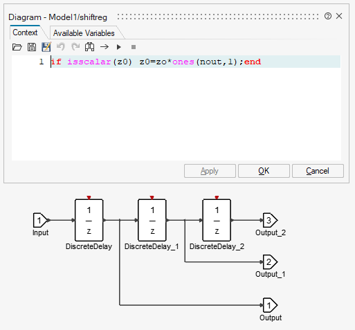 You can extend the above code so that it can work for arbitrary nout number of delays and outputs. Note that the individual error tags are removed so that all errors are referred to the parent. The new script below used in the context of the super block is also extended to produce better error messages: