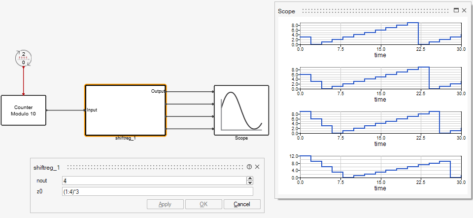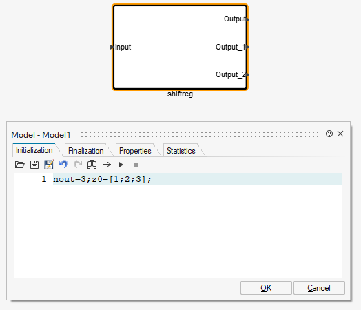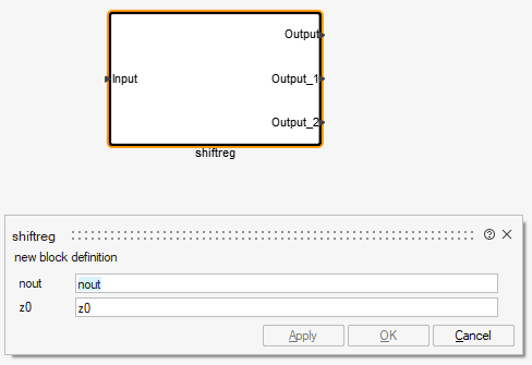 In this example, the problem is to create a shift register block where each register value is exposed through a separate output. The number of registers and outputs is variable and equal to nout, given as a block parameter. In the case of three registers and outputs (nout=3), the diagram is as follows: