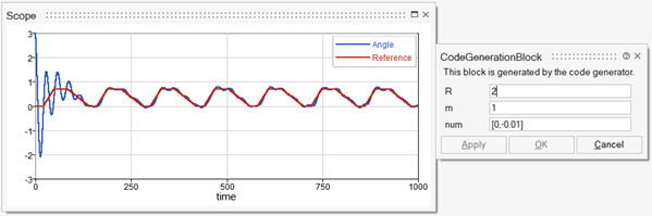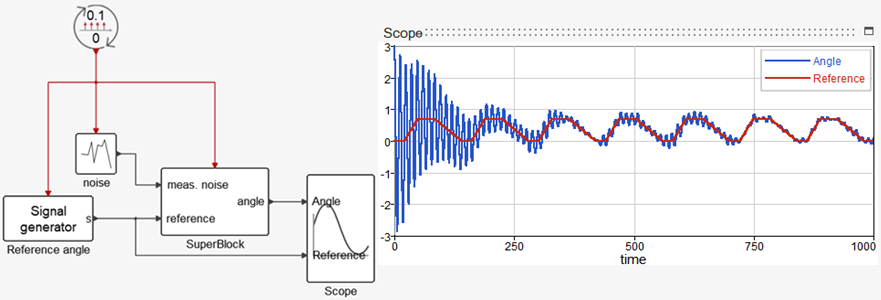 You can see the complete model in the following diagram where the measurement noise and the reference angle are provided. A Scope plots the actual angle and the reference angle. The frequency of the sampling is set to 10Hz. The parameter values are m=1, R=2 and num= [-0.1,0.04].