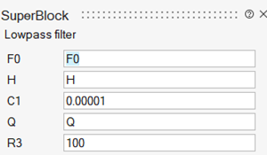 The filter is usually specified in terms of its cutoff frequency F0 = ω0/(2π), quality factor Q = 1/a, and gain H. These parameters will be used as exposable parameters for this model. The resistor and capacitor values should be computed as a function of these parameters.